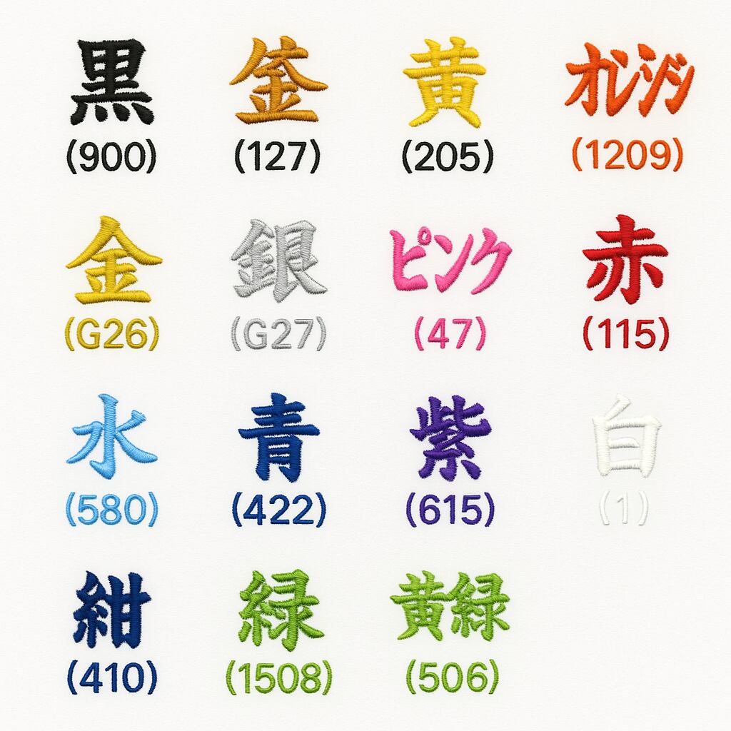 ③ネーム糸色(カラー番号):黒(900)、 金茶(127)、 黄(205)、 オレンジ(1209)、 金(G26)、 銀(G27)、 ピンク(47)、 赤(115)、 水色(580)、 青(422)、紫(615)、白(1)、紺(410)、 緑(1508)、 黄緑(506)